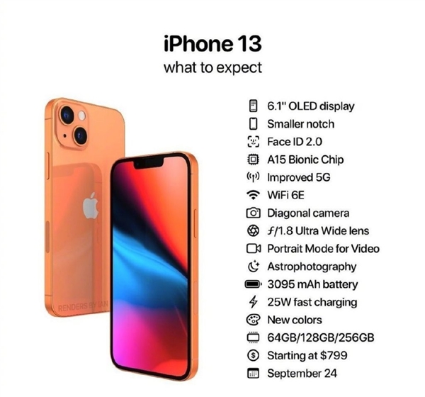 随着苹果iPhone 13发布会的日益临近,关于该机的配置信息也已经基本明朗,目前的多方消息都显示苹果今年将依然推出四款机型,分别是iPhone 13 mini、iPhone 13、iPhone 13 Pro、iPhone 13 Pro Max。 近日,有海外网友曝光了其中iPhone 13的详细配置和售价信息,首先在外观上,虽然苹果做出了不少的改进,但是一眼就能看出师承iPhone 12的设计语言,依然采用和直角边框的设计,且按键和摄像头等布局也基本一致。 不过,可以明显看出iPhone 13的正面屏幕刘海缩小,这是因为苹果升级了Face ID 2.0方案,刘海内部的结构排列发生了翻天覆地的变化,此前消息称该机的听筒会被挪到顶部边框的位置,以此来减小刘海面积。 核心配置方面,iPhone 13搭载了自研A15仿生芯片,此前消息称该芯片依然采用5nm工艺,但是却升级了台积电第二代5nm工艺,将会有效提升能效比,同时支持5G和WiFi6E标准。 值得一提的是,对于用户吐槽多年的续航问题,iPhone 13也开始着手解决,其配备了3095mAh电池,相比前代拥有明显升级,与此同时还进一步升级了快充,支持25W快速充电,虽然远落后于安卓旗舰,但是对于一块3095mAh的电池,还是能带来不错的体验。 至于存储方面,iPhone 13并未像传闻中iPhone Pro那样取消256GB版本,提供了64GB/128GB/256GB三种版本可选,起售价为799美元(约为5160元人民币),将于9月24日正式开售。 |