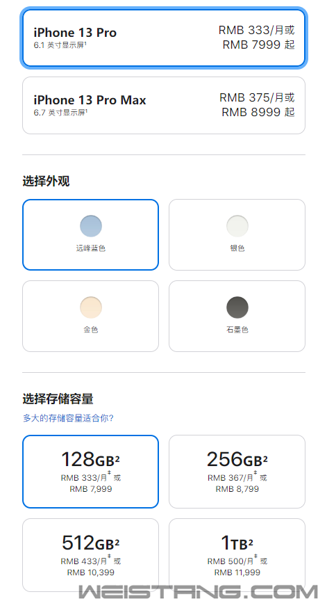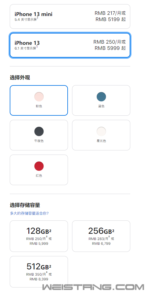 北京时间9月15日凌晨,苹果正式发布了新一代iPhone 13系列,照例包含四款型号,iPhone 13 mini、iPhone 13、iPhone 13 Pro、iPhone 13 Pro Max,是上一代的对位升级,无论刘海、屏幕,还是拍照、电池、存储都有惊喜。 现在,国行价格、配色、发售时间都公布了,一起来看下: iPhone 13 mini:128GB 5199元、256GB 5999元、512GB 7599元。 iPhone 13:128GB 5999元、256GB 6799元、512GB 8399元。 iPhone 13 Pro:128GB 7999元、256GB 8799元、512GB 10399元、1TB 11999元。 iPhone 13 Pro Max:128GB 8999元、256GB 9799元、512GB 11399元、1TB 12999元。 对比上代,iPhone 13 mini、iPhone 13起步容量翻了一番直接128GB,起步价都降低了300元,中间档不变,高配则贵了800元之多。 iPhone 13 Pro系列首次增加了1TB容量,顶配价格来到了创纪录的1.3万,128GB/256GB分别降低了500元、300元,512GB的 分别降低了700元、500元。 配色方面变化非常大,iPhone 13 mini、iPhone 13都是粉色、蓝色、午夜色、星光色、红色五种可选,iPhone 13 Pro系列则是远峰蓝色、银色、金色、石墨色四种可选。 iPhone 13全系列将在9月17日晚8点预售,9月24日正式发售。 |