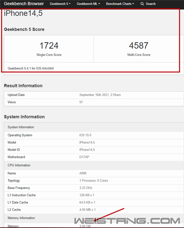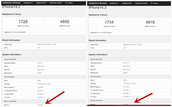 尽管按照苹果公布的纸面数据,A15处理器对比A14,CPU性能几无变化,不过从GeekBench 5跑分来看,无论单核还是多核仍有有所提升,甚至可以达到两位数增幅。 从型号来看,iPhone 14,5预计对应iPhone 13,配4GB RAM;iPhone14,2预计对应iPhone 13 Pro,配备6GB RMA;iPhone14,3预计对应iPhone 13 Pro Max,配备6GB RAM,这与早些时Xcode识别到的信息呼应,也就是说iPhone 13系列RAM容量和iPhone 12系列一致,并没有8GB出现。 成绩方面,单核最高1738分,多核最高4818分,最高频率3.23GHz,比A14识别的2.99GHz提升了8%。 按照苹果说法,A15集成150亿颗晶体管,比A14多出27%,CPU比竞品快50%、5核GPU比竞品快50%、NPU性能增加43%、系统缓存翻番到32MB。 |