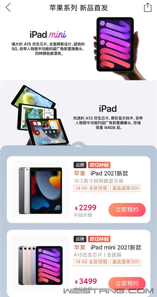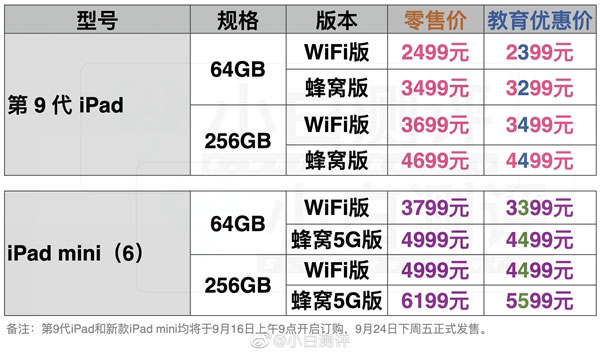 今天(9月16日)上午9点,苹果秋季新品发布会上刚刚推出的iPad mini 6和iPad 9在官网开启预购,9月24日首批交付及正式开卖。 拼多多百亿补贴专区已经上架两款产品,定于14点开启全款预售。 价格方面,iPad 9起步价做到了2299元,比官网正价便宜200元;iPad mini 6做到了3499元,比官网正价便宜300元。 拼多多百亿补贴上架iPad mini 6、iPad 9:比官网便宜300元 对比发现,拼多多百亿补贴的iPad 9比教育优惠(2399元)还便宜,不过iPad mini 6倒是没教育优惠(3399元)划算,同时有教育优惠渠道的朋友,注意选购技巧。 虽说目前便宜的幅度不高,但相较于官网购买,至少省了贴膜、保护壳的配件钱。 回到产品本身,iPad 9外形、续航等不变,但升级到A13处理器、屏幕支持原彩显示、可选64GB和256GB存储、前置1200万像素广角镜头等。 iPad mini 6则首次采用8.3寸全面屏、A15处理器、蜂窝版支持5G网络、采用全功能USB-C接口等。 |