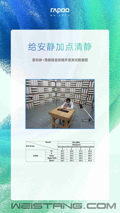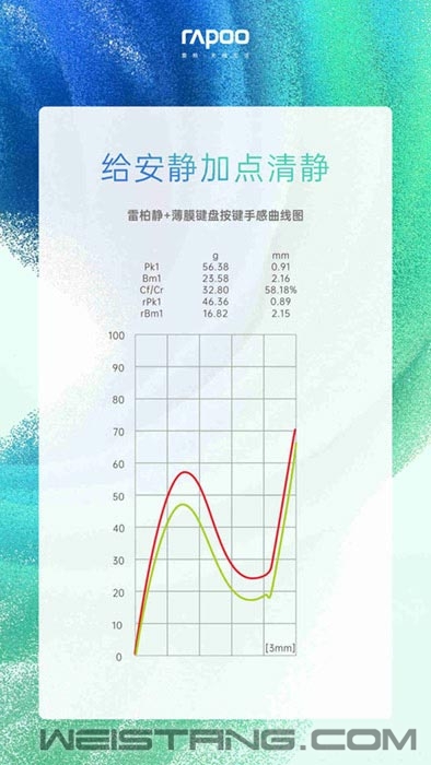 给安静加点清净。 和菜市场的熙攘形成鲜明对比的是,每碗牛肉面赋予人的【片刻安静】,沸水滚滚,汤头无声。 和外放喧闹声音形成鲜明对比的是,遵循自己心里牵引力做事的【片刻安静】,集体疯狂,个体蝉静。 和舞台上极尽癫狂华丽形成鲜明对比的是,勇敢清零的【片刻安静】,沉淀积累,悄然发生。 【片刻安静】,于你,存在吗? 雷柏在找一个声音,可以增加隐私性的声音,夜间居家办公不再打扰他人,似有若无萦绕其间。 被丢进这个波谲云诡的时代,我们每天奔波在名利场里,听着各种声音,乐此不疲,夜以继日。细带高跟的踢踏声、咖啡厅的交谈甚欢、会议室的唇枪实战,它们各自有线条、脾气,混杂、交错、缠绕。声音可以创造感官愉悦,也可以引发不愉快的交流。 【雷柏“静+”薄膜键盘】应势推出,令长时间处于紧张工作状态的现代人们减少噪音输入、静谧性进一步提升。在一切被动中找寻主动的空间,“给安静加点清净”,输出清晰、准确的文字表达,获得最恰当的应用。 X2000无线套装释出雷柏“静+”薄膜键盘,获得最恰当的应用。 【静】+,【静】佳 按键下压时键帽卡榫撞击键盘底盖、回弹时键帽卡榫撞击键盘中框或上盖,这是传统薄膜按键触碰操作发出声响的主要原因。 每个人都有寂静的记忆,可能是某一次傍晚回家看到的风吹草动,可能是公园草坪上独自坐过一次,可能是借助【静】+薄膜键盘互不打扰,有效压制喧嚣。静+薄膜键盘按键在结构上做创新调整,触感轻柔,声音静谧。 迭代新思路,在按键内部优化隔音罩型导电硅胶与底部润滑油,让按键受力下压与回弹时能有效减弱撞击声,通过第三方权威检测机构测试,dB值均值20.35。自然有声,蕴涵世间万物。指尖无声,舞起炙焰归于寂静。 【gēng】新,【gèng】新 轻柔的起伏,记录灵感溢出时刻。 关于薄膜按键层面,它带有长久历史,关于外设层面,雷柏的创造基因与生俱来,融合新的概念,解决使用中的细节痛点,将经典和前卫需求融汇在一起。传统火山口型薄膜按键,按键行程往往大于3mm甚至4mm,长期使用容易造成疲劳。火山口结构的易打理、防泼溅等特性,被雷柏“静+”薄膜键盘按键合理的利用起来,3mm键程,手感轻柔固定,整体用户使用感有效提高。 从声音的消解触发,雷柏静+薄膜键盘,建立一种新的“空间契约”,互不干扰。 探索人与众生之间的微妙平衡,散去城市的喧嚣拥挤,留下天人一物的自我排解。可以静看天际云卷云舒,也能干净利落地转身,潇洒行走于寰宇。 |