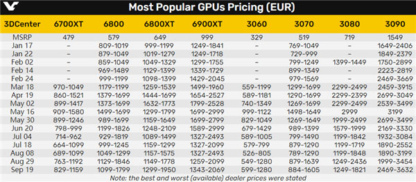 目前,NVIDIA RTX 30系列的价格相比官方建议零售价平均贵了74%,自从七月初以来一直在在缓慢上涨;AMD RX 6000系列则是平均70%,最近一个半月以来持续走高。 具体型号方面,相比上次统计倒是有涨有跌,RTX 3090、RX 6700 XT、RX 6800 XT的涨幅尤其明显,RX 6800、RTX 3080则有所下跌。 RX 6600 XT的情况是最糟糕的,作为AMD迄今最便宜的新一代显卡,建议售价仅379欧元,但实际上已经逼近600欧元。 3DCenter这次还增加了供货情况曲线,结果和价格曲线走势完全相对应,7月初以来,供货是越发紧张,而在供货最少的5月中上旬,NVIDIA、AMD的价格正好是最高的,当时的NVIDIA显卡平均溢价达到了创纪录的204%。 AMD即将发布RX 6600,NVIDIA则甚至没有向厂商提到过RTX 3050系列。 |