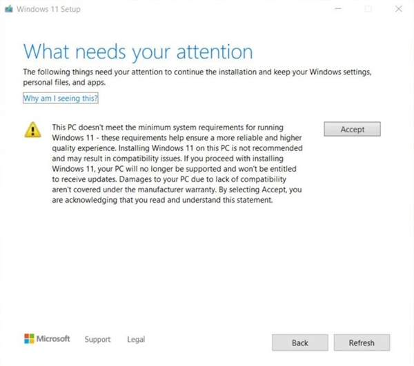 再过两周微软就要发布Win11正式版了,过去的3个月中争议最多的就是Win11的硬件兼容了,微软这次设定的门槛很奇特,会导致很多人无法升级Win11。 在硬件兼容问题上,包括4GB内存、64GB存储、UEFI安全启动等在内的要求没啥问题,主要是TPM 2.0及CPU要求,其中CPU需要八代酷睿及锐龙2000系列及之后,前不久微软放宽了部分七代酷睿支持Win11,但主要局限于高端型号,大部分七代酷睿CPU依然不兼容。 对于达不到硬件兼容的设备,微软表示可以通过官方的Meadia Tool工具自行安装,但是微软表示这种安装方法不能保证稳定,崩溃次数比兼容设备高了52%。 除了崩溃更多,现在非兼容设备上安装Win11还会有另外的代价,那就是Windows更新不能用了,微软不会给这类设备提供更新维护。 以上两个政策还不管用的话,微软现在还推出了另外的政策,那就是在不兼容设备上安装Win11系统,会弹出提示称这台PC没有达到安装要求,微软不建议执行系统升级之类的操作,设备也不在厂商的保修范围内,您的设备就不受支持或者无权获得更新。 简单来说,就是微软虽然不会阻止用户在不受支持的设备上安装Win11,但现在他们要求用户签署免责声明,对售后及支持等内容免责,要求用户自己承担后果,以后别找微软的麻烦。 |