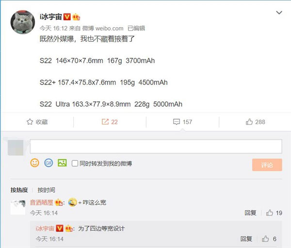 9月25日消息,数码博主@i冰宇宙曝光了三星Galaxy S22系列的细节。 据悉,Galaxy S22系列包括S22、S22+和S22 Ultra三款,对应中杯、大杯和超大杯,具体三围尺寸如下: Galaxy S22:146×70×7.6mm 167g 3700mAh Galaxy S22+:157.4×75.8x7.6mm 195g 4500mAh Galaxy S22 Ultra:163.3×77.9×8.9mm 228g 5000mAh 其中Galaxy S22定位轻薄,重量只有167g,而Galaxy S22+则是四边等宽的设计。 三星Galaxy S21系列 按照惯例,Galaxy S22系列将会搭载高通下一代旗舰处理器骁龙898(全球首批搭载),另一版本则搭载Exynos 2200处理器,后者集成了AMD GPU。 该机可能会在2022年1月份亮相,高通骁龙898预计在2021年12月份亮相。 |