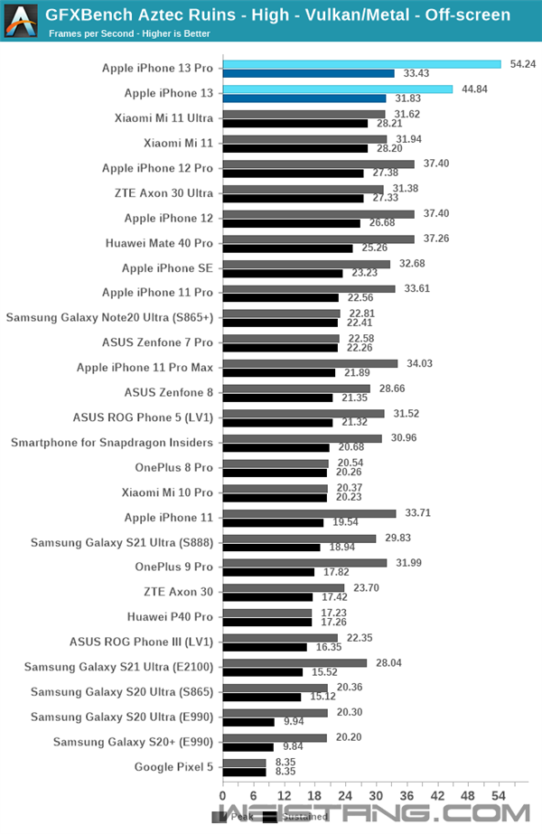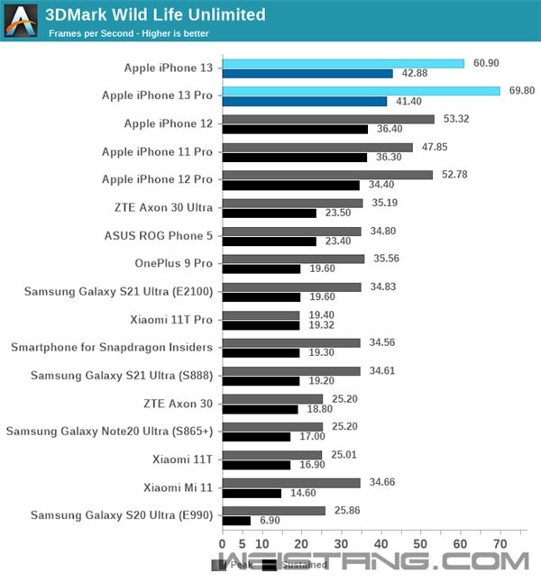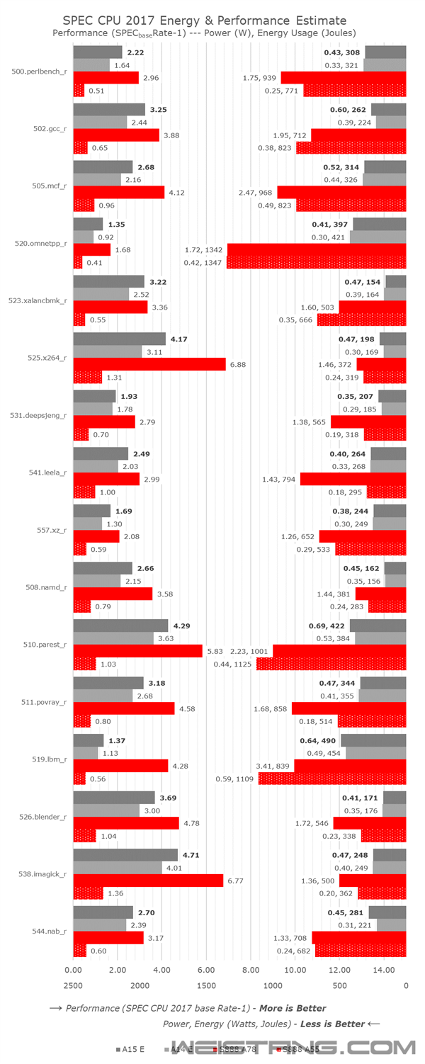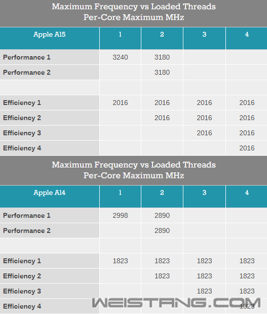 iPhone 13系列、第六代iPad mini都用上了苹果最新的A15 SoC。 虽然它和上代A14相比有些挤牙膏的味道,但毕竟根基深厚,实力仍然是顶级的存在。AnandTech也对其进行进行了详尽的测试。 一、A15架构简介 A15继续集成六核心CPU,包括两个高性能大核心、四个低功耗小核心,同时有4-5个GPU核心,以及新的显示流水线、视频编码器、视频解码器、ISP,以及翻倍的系统缓存、更强的神经网络。 CPU方面,大核微架构和A14上相比几无变化,至少后端的吞吐能力、延迟完全不变。 小核变化相对多一些,比如整数ALU从3个增至4个,还有缓存子系统TLB的升级。 运行频率则全面提升,单个大核最高可达3240MHz,对比A14提高了242MHz,两个大核并行则是3180MHz,提高了290MHz,小核则一律最高2016MHz,提高了193MHz。 A15制造工艺还是台积电5nm,猜测应该是增强版的N5P,对频率提升也有贡献。 系统缓存从A13/A14上的16MB翻番来到了32MB,其中大核二级缓存也从8MB增加一半来到12MB,这比骁龙888等其他SoC的总缓存都要大,同时追平苹果M1,但只服务两个核心而非四个。 小核的二级缓存则继续保持在4MB,但增加了TLB。 二、CPU性能测试 CPU部分的测试使用SPEC CPU 2017,除了对比性能高低(左侧),还加入了功耗的对比(右侧)。 大核方面,相比上代提升最少2.5%,最多可达37%。 提升最多的子项是52.0omnetpp_r,尽管功耗略有增加,但能效依然提升了24%。 提升最少的子项是505.mcf_r,对内存延迟更敏感,但有趣的是功耗降低了几乎0.9W,因而能效提升了22%。 有趣的是,525.x264_r、538.imagick_r等子项性能提升也不多,但能效同样提升了13%。 功耗最高的是519.lbm_r,吃掉了6.9W,但能效依然提升了17.9%。 无论是骁龙888 X1大核心,还是三星Exynos E2100 X1大核心,在A14面前都追赶不及,更别说A15了。 小核方面,相比上代提升最少也有8.4%(531.deepsjeng_r),最多则可达46%(520.omnetpp_r),综合提升为23%,换算下来IPC大幅增加了11.6%。 功耗基本持平,因此能效提升没有大核那么明显。 骁龙888里的A78、A55核心更是完全不能打了,比如说对比A55,A15小核性能平均高出3.5倍,功耗只高了32%,因此能效超出60%之多。 以上是A15大小核在SPECint 2017、SPECfp 2017中的能效与其他SoC的整体对比,还拉上了AMD、Intel的部分型号作参考。 其中,A15大核的能效值达到了7.28,几乎和AMD顶级的锐龙9 5950X完全持平,也明显领先苹果M1。 三、GPU性能测试 iPhone 13第一次不同型号配置了不同的GPU规格,13 Pro系列都是完整的5核心,13 mini、13则只有4核心。 本次测试的是13、13 Pro。 3DMark Wild Life测试中,13 Pro、13峰值性能分别比上代提升了30%、14%,峰值性能是竞品的至少两倍。 不过持续性能方面,13反而比13 Pro更高一些。 Basemark GPU测试,13 Pro提升了28%,13只比其慢了大约5%。 GFXBench阿兹特克废墟High级别测试中,13 Pro、13分别大涨46%、19%,超出想象,可能要感谢翻倍的系统缓存。 再看实际功耗,13系列明显降低了不少,13 Pro、13峰值分别可以达到6.70W、5.92W,都低于12 Pro、11 Pro,但很快就会过热降频,稳定功耗分别为3.58W、3.05W,还是低于前两代。 GFXBench阿兹特克废墟Normal级别测试中,13 Pro、13的性能、功耗也是类似的表现,其中13 Pro的稳定性能领先13 11%。 GFXBench曼哈顿测试中,13 Pro、13峰值性能分别提升32%、18%,稳定性能则没有拉开差距。 从刚才的测试中可以看出,iPhone 13 Pro更容易过热,稳定性能也没有和iPhone 13拉开足够的档次,这可能和新的PCB电路板设计有关,更加紧凑,但加入了更大的电池、新的摄像头模组。 不少用户也反应,iPhone 13 Pro系列确实更容易在游戏、通话中过热。 至于实际游戏测试,由于Android、iOS平台的游戏很难完全统一,并不好直接对比。这里以《原神》为例,跑了iPhone 13 Pro Max,以及骁龙888的三星Galaxy S21 Ultra、小米11 Ultra。 四、总结 苹果A系列SoC一直是行业标杆,今年的A15似乎有点挤牙膏的味道,从工艺到架构再到技术都没有突破性的变化。即便如此,它仍然有不少惊喜。 CPU方面,核心架构没有大改,只是一些微调,频率和性能也高了一些,但最关键的是能效变化,尤其是大核的功耗明显降低,小核的性能也大涨了23-28%,而功耗变化不大。 再加上电池容量增大,难怪iPhone 13系列的续航表现好了不少。 GPU方面,峰值性能已经将安卓阵营甩到了另一个世界,只是由于主板设计等因素,无法发挥出最大潜力,持续性能发挥受到一些限制,当然即便如此依旧是顶级的存在。 |