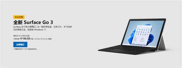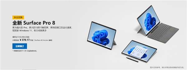 国庆假期之前,微软召开了一场全球新品发布会,推出了迄今最强的Surface Pro 8、Surface Go 3、Surface Pro X(Win11/Wi-Fi版)等产品。 同时,微软官方还特意强调,此次新品也将同步登陆中国市场。 根据微软官方消息,Surface Pro 8和Surface Go 3的国行版本已经在今日(10月12日)正式开启预售,售价从2988元至18588元不等,心仪的用户可前往官方商城挑选。 此次新品之中关注度最高的自然是Surface Pro 8,该机采用了全新的模具方案,PixelSense屏幕尺寸从12.3英寸放大到13英寸,边框进一步收窄,整体屏占比极高。 参数方面也非常出色,分辨率为2880×1920,像素密度267PPI,最大的改进是支持了杜比视界(Dolby Vision)、120Hz高刷、多点触控,亮度增加12.5%,还支持Dolby Atmos音效。 顶部边框中央集成500万像素1080p摄像头,支持Windows Hello红外识别和人脸登陆,后置1000万像素4K摄像头。 处理器采用Intel Tiger Lake-U 11代酷睿低功耗版,最多4核心8线程,消费版可选i5-1135G7、i7-1185G7,商务版可选i3-1154G4、i5-1145G7等。 通过Intel Evo严苛认证,号称对比上代CPU性能提升最多40%,GPU性能提升最多75%。 Surface Pro 8也是迄今最轻最薄的Surface Pro系列产品,厚度仅为9.4毫米,重量不过891克。 至于Surface Go 3则是Surface迄今最为便携的二合一笔记本电脑,采用10.5寸触摸屏,554g镁合金机身,最高搭载英特尔酷睿i3处理器,速度提高60%,还提供LTE增强版可选,最长11小时续航。 具体规格及售价: Surface Go 3 Intel奔腾6500Y/4GB/64GB 售价2988元 Intel奔腾6500Y/8GB/128GB 售价3988元 Intel酷睿i3/8GB/128GB 售价4588元 Suface Pro 8 Intel酷睿i5/8GB/128GB 售价8088元 Intel酷睿i5/8GB/256GB 售价8788元 Intel酷睿i5/16GB/256GB 售价10188元 Intel酷睿i5/8GB/512GB 售价10188元 Intel酷睿i7/16GB/256GB 售价11588元 Intel酷睿i7/16GB/512GB 售价13688元 Intel酷睿i7/16GB/1TB 售价15788元 Intel酷睿i7/32GB/1TB 售价18588元 |