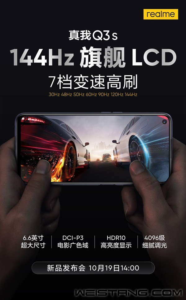 10月15日消息,realme副总裁徐起宣布,realme将于10月19日发布realme Q3s。 海报显示,realme Q3s采用了144Hz旗舰LCD全面屏,支持7档变速调节(具体是30/48/50/60/90/120/144Hz),根据应用场景智能匹配,流畅省电二者兼顾。 而且realme Q3s支持DCI-P3电影广色域,色彩显示丰富逼真;支持HDR10高亮度显示,支持4096级细腻调光。 徐起强调,realme Q3s是realme Q系列百万爆款的全面升杯之作,质感相当不错,同时有144Hz高刷,带来超乎想象的流畅体验。 值得注意的是,这场发布会realme还将带来GT Neo系列新品——realme GT Neo2T。 它采用的是120Hz高刷OLED屏幕,搭载联发科天玑1200AI版,预计会配备8GB内存,大电池、超级快充这些规格也不会缺席。 |