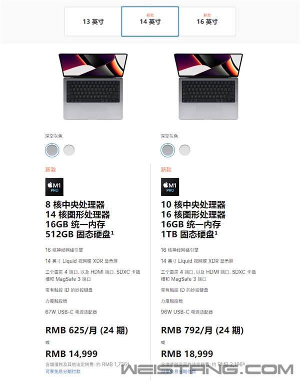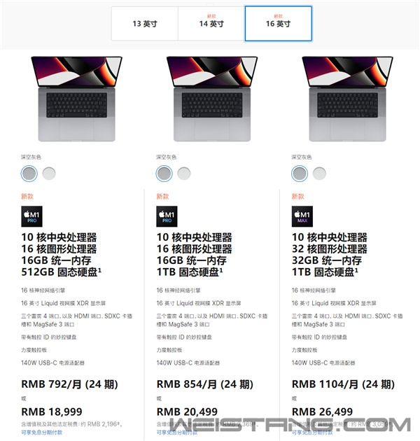 苹果2021年秋季第二场发布会果然是两大重点新品,新一代MacBook Pro笔记本来了,AirPods 3无线耳机来了,意外的是HomePod mini升级了新配色,处理器更是带来了王炸级别的M1 Pro、M1 Max。 HomePod mini定价还是749元,11月开卖。 配色除了深空灰、白色,现在还可选蓝色、黄色、橙色。 AirPods 3定价1399元,相比上代涨价120元。现已开放预订,10月26日开卖。 与此同时,AirPods Pro 1999元,AirPods Max 4399元,构成完整的三条产品线。 MacBook Pro 14英寸有两种配置: 一是8核心CPU、14核心GPU、16GB统一内存、512GB SSD、67W USB-C充电器,定价14999元。 二是10核心CPU、16核心GPU、16GB统一内存、1TB SSD、96W USB-C充电器,定价18999元。 MateBook Pro 16英寸则有三种配置: 一是10核心CPU、16核心GPU、16GB统一内存、512GB SSD、140W USB-C充电器,定价18999元。 二是10核心CPU、16核心GPU、16GB统一内存、1TB SSD、140W USB-C充电器,定价20499元。 三是10核心CPU、16核心GPU、32GB统一内存、1TB SSD、140W USB-C充电器,定价26499元。 配色都可选深空灰色、银色,但是都未公布具体处理器型号,似乎目前的都是M1 Pro,未来再增加M1 Max版本。 发售时间未定,按惯例需等待批准。 |