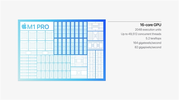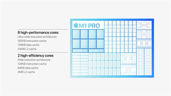苹果M系列自研处理器如期上新了,但不是M1X,也不是M2,而是一口气两款,M1 Pro、M1 Max。 原有的M1 5nm工艺制造,160亿个晶体管,集成四大四小八个CPU核心、八个GPU核心、16个神经引擎AI核心,支持统一内存架构。 先来看M1 Pro,依然采用5nm工艺,晶体管数量多达达337亿个,其中CPU核心来到十个,包括8个大核心、2个小核心。 其中,大核心采用超宽流水线架构,每个核心还是192KB一级指令缓存、128KB一级数据缓存,共享二级缓存随着核心数翻番至24MB。 小核心为宽流水线架构,每个核心继续128KB一级指令缓存、64KB一级数据缓存,二级缓存4MB,平均每个核心翻了一番。 GPU部分所有规格直接翻番,16个核心,2048个执行单元,支持最多49512个并发线程,浮点性能5.2TFlops,纹理填充率1640亿每秒,像素填充率820亿每秒。 还是统一内存架构,总容量达32GB LPDDR5,256-bit位宽,200GB/s高带宽和低延迟,并采用了苹果设计的定制封装,CPU部分直接访问系统内存,GPU部分有自己的显存。 神经引擎还是16核心,另有独立的媒体引擎,支持硬件加速H.264、HEVC ProRes/ProRes RAW视频编解码,支持多个4K、8K ProRes视频流。 其他还有支持双屏输出、雷电4、安全加密等。 性能方面号称拥有业界领先的能效比,CPU性能在30W功耗上是传统八核心笔记本处理器的1.7倍,GPU功耗在同等性能下比独立移动显卡低70%。 |