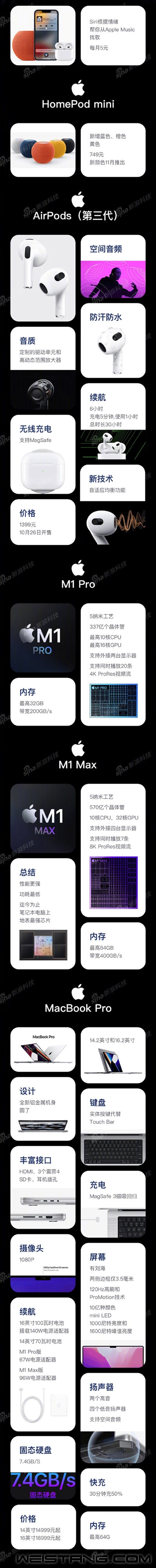 今天凌晨(10月19日),苹果举办了“来炸场”活动,推出了包括刘海屏MacBook Pro、M1 PRO/MAX处理器、AirPods 3无线耳机、新配色HomePod mini等产品。 如果你没有熬夜或者想要快速了解发布会内容,不妨来看新浪整理的一图看懂。 简单来说,M1 PRO/MAX是5nm 10核处理器,其中PRO集成16核GPU,最高支持32GB内存和200GB/s带宽,M1 MAX则集成32核GPU,最高64GB内存和400GB/s带宽。 对应到MacBook Pro上,16寸可选M1 MAX处理器,64GB+8TB版本顶配的价格高达45999元。 当然,对于MBP来说,芯片之外的看点也不少,包括集成1080P高清摄像头的前刘海设计,取消TouchBar触控栏,120Hz高刷屏,mini LED显示屏峰值亮度1600尼特,16寸续航长达21小时等。 最后是AirPods 3耳机,短柄设计,H1芯片加持,没有主动降噪功能,支持空间音频,标配无线充电,听歌续航6小时等,且价格1399元,比上一代无线充电版本便宜了200元。 |