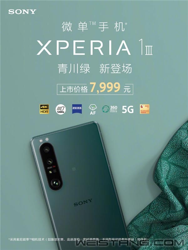10月21日消息,昨日晚间,索尼Xperia官微宣布,索尼Xperia 1 III新配色——青川绿正式登场。 目前,这款该机已开启预售,上市价7999元,10月20日-11月11日期间购机,可享最高24期免息、限量赠送手机壳以及至高千元以旧换新补贴。 ID设计上,索尼Xperia 1 III沿用“万年不变”的设计方案,机身整体较为细长、方正,是市面上为数不多的21:9带鱼屏方案。 据了解,索尼Xperia 1 III搭载全球首款6.5英寸21:9 CinemaWide 4K HDR OLED显示屏,支持120Hz刷新率,以及240Hz触控采样率、10bit色深等顶级配置。 既然号称是“微单手机”,影像能力表现如何? 这一次,索尼Xperia 1 III 依然由Alpha单反团队参与调教,三颗镜头均为1200万像素,此外还配有3D ToF传感器,焦段16~106mm,最大光圈F/1.7,能实现20张/秒连拍、眼部对焦等。 视频支持4K 120FPS录制、H.265格式、5倍慢动作等。 不仅如此,相机模组还拥有蔡司光学校准,以及蔡司T*镀膜涂层,可呈现更加精美的画面细节和对比度。 核心性能上,索尼Xperia 1 III搭载骁龙888处理器,配备12+256GB存储,内置4500mAh容量电池,支持30W有线快充和无线充电、无线反充。 |