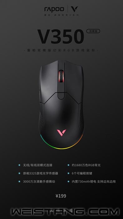 在这个科技飞速发展的时代,随处可见的无线科技,无线似乎已然成为趋势,近日,领军国产外设品牌,实力大厂上市企业Rapoo雷柏推出了V350双模版幻彩RGB游戏鼠标,有线/无线自由切换,搭载电竞2.4G无线传输模块,即刻开启无线游戏时代。底部设有接收器收纳仓,解决放置问题,92克的整体机身让人一见钟“轻”,走A甩狙微操一气呵成。 无“线”风光在险峰。V350双模版搭载2.4G无线传输模块,有线/无线自由切换,只需在电脑接口插入小型接收器,即刻进入无线游戏时代。雷柏在V350双模版有个小细节,在鼠标底部设有接收器收纳仓,解决了放置问题。配置原相3325传感器,准确定位每一帧,1ms的疾速响应,能更好的帮助玩家实现游戏中各种细节微操。内置730mAh可循环充电锂电池,续航长达16-48小时,通过USB-C连接充电,亦能边充边玩,持续游戏作战,助你杀敌红尘中脱身白刃里,拿下游戏MVP,享受属于你的高光时刻! 3000万次的微动开关,持久耐用,整体采用轻量化设计思路,运用人体工学,保留核心元器件的同时,重量仅约92克,能更好的适应激烈的战斗,轻盈的机身带来更快的操作。 预设800/1200/1600/2400/3200/4000/5000,7档DPI,根据不同游戏,设置属于自己适合的灵敏度,告别生涩移动。6个可编程按键,录制自定义宏,游戏一键打出炫酷连招,化繁为简,助你步步为营,享受智慧游戏。 能打又好看,精心勾勒的曲线,前半部分下凹后缓缓回升,为手指预留放置空间,侧裙孔状纹理工艺具备排汗效果并有着出色的防滑性能,长时间游戏亦能持续好的手感。 V350有着1680万色RGB背光系统,滚轮区、Logo区、尾部三区域同时绽放,通过内置驱动可自定义背光颜色,千丝万缕,光影交织,通过中键+后退键,快速切换你想要的背光效果,氛围的营造,来源于RGB灯效收放自如的掌控,快来打造专属于你的电竞色彩。 V350双模版幻彩RGB游戏鼠标92克轻盈的机身内蕴含着大大的能量,内置730mAh可循环充电锂电池,搭载2.4G无线传输模块,有线/无线自由切换。原相3325传感器准确定位每一帧。7档DPI,6个可编程按键,化繁为简,方便快捷。1680万色RGB背光系统,营造出炫酷的电竞色彩,官方指导价199元,现已上市!! |