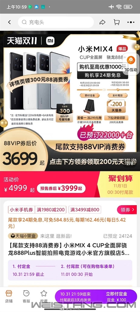 MIX 4发布之后一直叫好不叫座,屏幕和照相体验跟价位明显不符,今天,小米终于坐不住了,天猫官方旗舰店显示,88VIP用户可以领取300元消费券,下单小米MIX 4再减300元,3999元的MIX 4实际到手价为3699元(8GB+128GB)。 这是小米旗下第一款采用屏下摄像头技术的高端旗舰,实现了正面无刘海无挖孔的真全面屏形态。 核心配置上,小米MIX 4屏幕刷新率为120Hz,分辨率为FHD+(2400×1080),搭载高通骁龙888 Plus旗舰处理器,前置2000万像素,电池为4500mAh,支持120W有线、50W无线秒充。 |