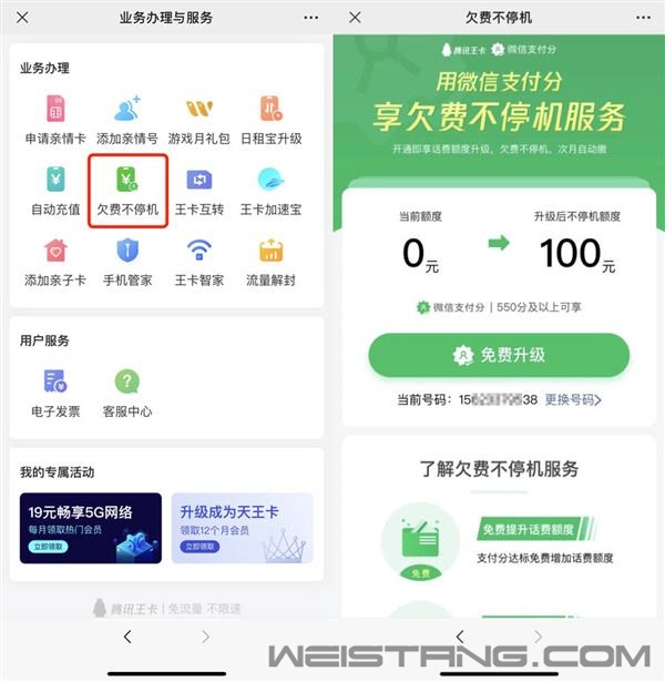 想必大家都遇到过手机欠费停机的情况,如果连接有无线网络还好,如果恰好在户外没有WiFi的情况下,就会非常尴尬,令人着急。 而作为国民软件的微信,近日却彻底解决了这个问题。 据报道,近日有网友发现,在微信里可以申请手机“欠费不停机”服务,开通后可享有一定的欠费额度,避免因月初忘缴或漏缴话费导致“停机无法上网、断网无法缴费”的尴尬情况发生。 根据曝光的页面显示,目前“欠费不停机”主要面向北京、上海、江苏、四川、湖南等国内大部分地区的腾讯王卡相关用户,且用户需开通支付分并达到550分及以上才能申请使用。 也就是说,目前这项业务只针对腾讯王卡的用户,普通用户暂时还无法使用,令人有些遗憾,期待腾讯能够在后续尽快加入其它套餐的支持。 具体来看,目前王卡用户可以通过“微信公众号“王卡助手”-个人中心-业务办理-欠费不停机”开通服务,目前这项服务提供的“欠费额度”有100元、120元、150元三档,用户清缴欠费或欠费自动代扣后,额度会自行恢复。 |