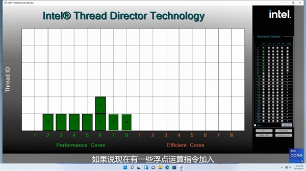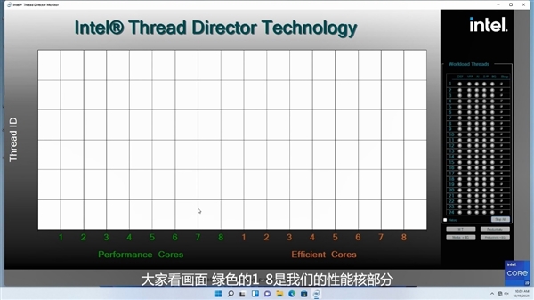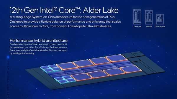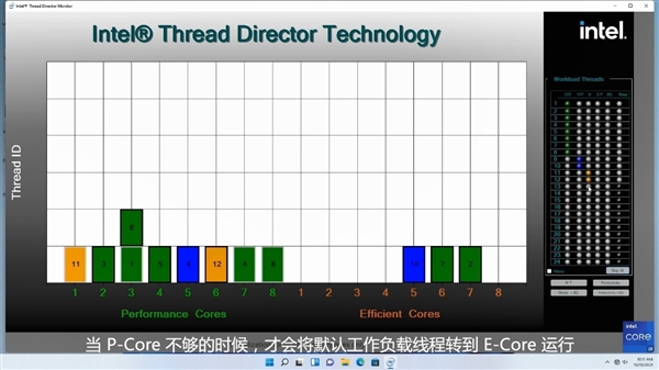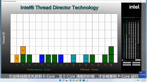Alder Lake 12代酷睿可谓x86架构近年来最大的变革,不但拥有全新工艺、CPU架构、DDR5内存、PCIe 5.0总线、封装接口等等,更是首次在主流消费领域融入了混合架构设计。 它同时集成性能核(P核)、能效核(E核)两种不同的CPU核心,都是最多8个,彼此搭配,可灵活满足单线程、多线程、多任务等各种应用场景的需求。 此设计公布以来,大家一直非常关心的问题主要有两个,一是E核的性能水平如何,是否可以胜任日常负载,二是两种核心如何调度分配,执行效率如何,甚至会不会出现“一核有难N核围观”“的极端情况。 对于第一个问题,Intel给出了明确数字:同等频率下的单线程性能,E核甚至比Comet Lake-S 10代酷睿还要高出1%,而对比P核也只差了大约27%,因此完全不必担心。 而关于两种核心的设计原理、运行规则、系统优化等话题,Intel此前已经反复讲了很多次,尤其是专门设计了“Intel Thread Director”(ITD/线程调度器),从硬件层面进行把控,再结合Windows 11操作系统的线程监控与调度分派,以及软件端的适配,全方位优化。 但是,纸上得来终觉浅,文字毕竟不够直观,Intel特意通过一款名为“Intel Thread Director Monitor”(线程调度监视器)的工具进行了一次形象化的演示,一看秒懂。 以酷睿i9-12900K为例,它有8个P核、8个E核,在监控页面以此列出,最右侧则是不同类型的工作负载,可以任意选择模拟加载,包括默认的高性能负载(DEF)、向量浮点运算指令(VFP)、AVX2/VNNI等AI指令(AI)、后台线程(BG)等等。 首先启动一些默认高性能负载,它们会被逐个分配到各个P核上,甚至会适时让一个核心处理两个线程。 注意,这些负载与核心的分配,并不是手动指定的,而是由ITD将负载信息反馈给操作系统,后者决定给予哪个核心来执行。 然后启动更高负载和优先级的VFP指令,ITD和Win11立刻将其分配给P核,同时将部分默认负载转移到E核。 接下来创建AI指令,它被认为更应该优先执行,就加入P核,同时将部分默认负载、VFP指令都放到E核。 最后加入一些后台线程,它们直接就放在了E核上,不会去抢占繁忙的P核。 在软硬件调度优化之下,大家不必担心两种架构核心的工作安排问题,即便是软件没有特殊优化,ITD、Win11也会做好自己的调度,而且未来随着越来越多的系统、软件做针对性优化,效率也会越来越高。 Intel客户端计算事业部副总裁、客户端计算事业部中国业务总经理Sunil Kaimal此前也曾明确表示,从长期来开,Intel会坚定地走混合架构,也会让所有开发者不论在哪个系统上,都能获得最好性能。 |