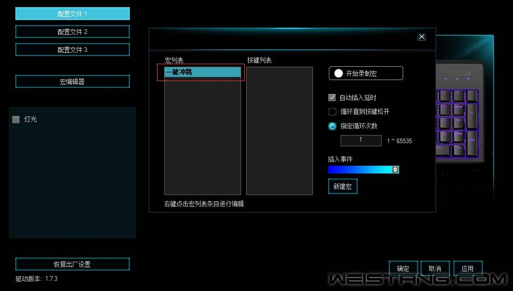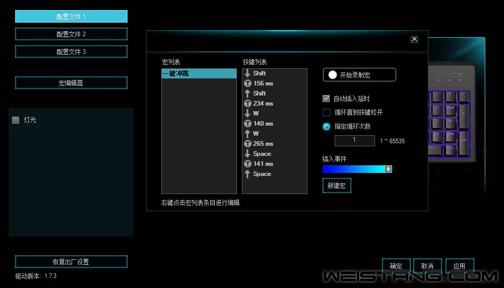 《永劫无间》是由24 Entertainment制作发行的一款动作游戏新作。在域外之地聚窟州,神秘的力量等待着来自各大文明的武者。玩家需要运用丰富的武器战胜敌人,而世界的真相将向最终的胜者展开。而冲跳作为游戏中必不可少的技能,能够迅速的通过高障碍物掩护自己躲避敌人的打击以及给予敌人出其不意的打击,增强走位的灵活性。今天笔者就使用雷柏V808RGB背光游戏机械键盘强大的宏定义玩出一键冲跳的灵活闪避。 宏怎么设置去完成冲跳的动作,需要先将按下默认的Shift键(冲刺)+W键(前进键),再按下Space键(跳跃),这样就能触发冲跳的动作。宏定义可以让你有效的闪避子弹的伤害,以及给予敌人出其不意的打击,增强走位的灵活性。下面就为大家讲解如何通过雷柏V808RGB的宏定义一键玩转冲跳。 步骤一:打开驱动,选中雷柏V808RGB的宏编辑,点击“宏编辑器”,再点击右下角的“新建宏”,命名为“一键冲跳”。 步骤二:将“一键冲跳”的一系列操作进行录制,点击界面开始录制宏,并依次输入Shift,W键,再次输入Space键,点击“停止录制”,即完成了一组宏命令设置。 步骤三:设置好一键冲跳的一系列动作之后,回到主页面,以T键为例,在设置页面,点击宏,选择刚才设置好的“一键冲跳”命令,点击“确定”后,点击“应用”,即可使用。 步骤四:设置完成后,就可以开启你的冲跳之旅,只要经过合理的设置,雷柏V808RGB让你在游戏中可以轻松跨过高大障碍物,既可以躲避敌人的追袭,也可以给敌人突入袭来的攻击。 RAPOO雷柏,领军国产外设品牌,实力大厂上市企业发布的V808RGB幻彩背光游戏机械键盘,樱桃Cherry MX机械轴的加入,提供了黑、青、茶、红四轴可选,1680万色幻彩RGB背光系统,游戏+办公模式19种灯光模式,并支持单键背光可独立设置,双色注塑键帽,104键全键无冲突设计,键线分离,板载内存等诸多亮点集一身的雷柏V808RGB,强大的驱动软件也让键盘的可玩性获得更大的提高,售价仅为499元,相信它一定会成为你首选的游戏利器,给你畅快的游戏操作体验。 |