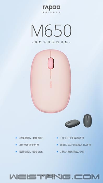保持自己的节奏,遵循一种自定的秩序,用手指在鼠标上互动,点触文件,滑动网站,然后在社交媒体、社交软件上发布沟通。见证人生百态,创造无限可能。 雷柏出于不断探索的渴望,想要捕捉寂静的时刻。沉思地看着简单的元素,组合成意想不到的事物---雷柏M650布丁无线鼠标,是顺眼且舒服的。 崇尚干净简约的设计,同时运用不同材质和颜色增加独特性。蜜桃粉、芝麻灰。布丁灵感,密谋出“桃”计划,分子级细腻,入口即化的空气感,轻薄绵密,甜而不腻。硅胶圈手感的加持,少女心随时爆棚! 呆萌扁平的造型,平滑圆润,柔和的边缘,流畅的接缝,舒适的握感充盈整个手掌。,在工作和生活之间逐渐找到让自己最舒服的平衡点,也是为了以更好的状态去面对下一个角色。可拆卸上下盖,存放接收器和电池,简单和便携的产品元素在M650下重新诠释。融入静音微动,有效减少点击噪音,安然沉浸于都市的喧嚣与静谧,点触之间,很踏实。 超有料的布丁鼠标,层次丰富一口满足,蓝牙5.0、蓝牙3.0和无线2.4G三大无线连接通道,实现笔记本、电脑、手机、平板等3台终端设备的快速连接切换,1300 DPI高精度寻迹引擎,9个月续航时长,低功耗、低延迟、高效率,产品深厚的功能与科技实力。 日历又翻到了十一月,一年一度的折扣盛世如约而至,雷柏M650布丁无线鼠标,京东限时五折秒杀价。用“中国智造”,享受可爱生活,在新商品和新体验中感受到美好生活的模样。 |