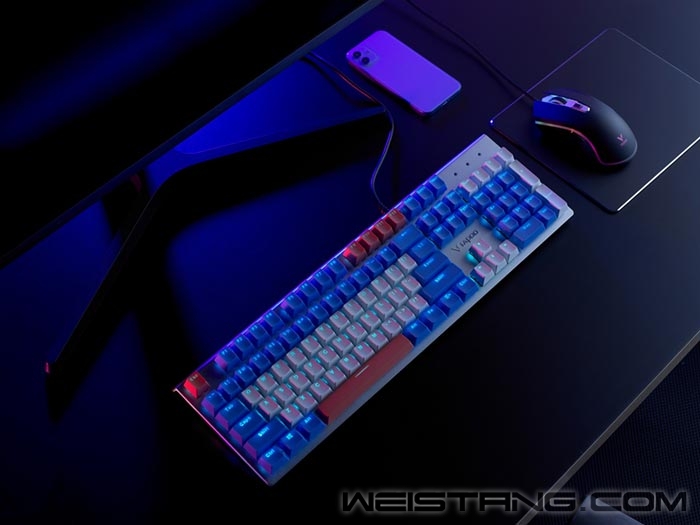 近日,领军国产外设品牌,实力大厂上市企业Rapoo雷柏推出了V530防水背光游戏机械键盘蓝礁湖冰茶,专为网咖市场打造。红白蓝三色的相辅相成,不同色彩碰撞出激情的火花。采用雷柏自主红外银轴,IP68级防水防尘,浸入水中亦怡然自得; USB口全键无冲,Windows锁,游戏必备;冰蓝色背光系统,12种预设光效,个性展现。时尚金属质感不凡的铝合金上盖,彰显细腻质感,让人抵挡不住V530蓝礁湖冰茶的诱惑。 V530蓝礁湖冰茶红白蓝三色相辅相成,不同色彩性格和金属材质特质。雷柏自主红外银轴,采用红外光阻断的方式导通,快速响应,稳定可靠,寿命可达5000万次;键盘外部接缝处严丝合缝,内部PCB板采用疏水纳米涂层保护,使得键盘的防水防尘等级达到了IP68级。即便意外将液体撒入键盘,也能快速导出,确保元器件正常工作。 键盘预设12种光效,支持全键光效自定义,超多玩法,乐趣无穷。键盘两侧各配备RGB氛围灯条,黑夜中奉上你专属的竞技色彩。 键盘上盖采用加厚铝合金板材,银色拉丝面板工艺,沉稳气质一目了然。键帽采用双色注塑工艺,透光均匀,远离字符褪色、磨损、模糊的困扰;通过Fn+F1~F6组合,可快速切换多媒体播放、音量调节等功能,便捷省心。104键全尺寸按键布局,USB连接模式即可实现全键位无冲突,通过Fn+Windows即可实现Win键锁定/开启功能,防止在激烈的游戏中因误触Win键而切出画面。 |
