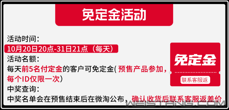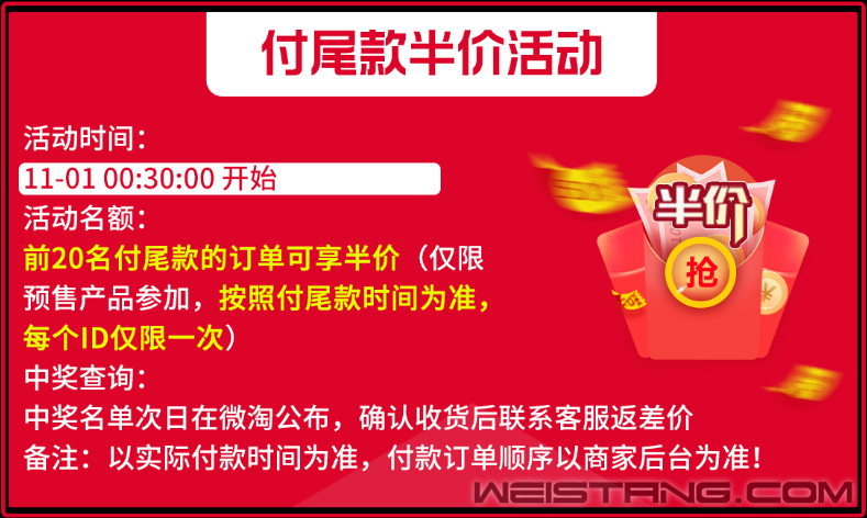 HyperX天猫旗舰店中,每天前五位支付定金的消费者,可以拥有免定金特权。如果错过前五名也不要灰心,支付尾款的前20名消费者可享半价特权,惊不惊喜意不意外!