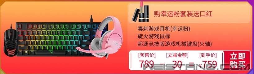 此外,预购女神套装的前20位付定金的消费者,将获赠口红一只。套装包括HyperX毒刺游戏耳机(幸运粉)、旋火游戏鼠标和起源竞技版游戏机械键盘(火轴)。