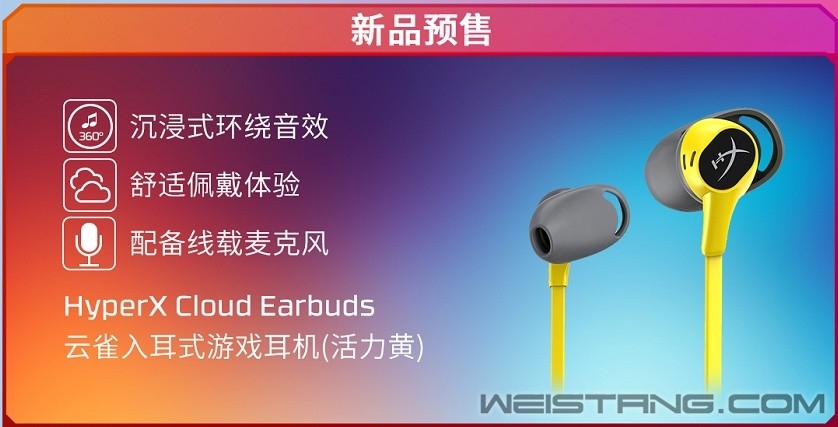耳机新品抢先体验 预售期间, HyperX云雀入耳式游戏耳机(活力黄)抢先上市。毕竟在游戏耳机领域,黑色占据了主旋律,其他有个性的配色少之又少,而此次新品的加入,让玩家看到了这款耳机更具活力的一面。