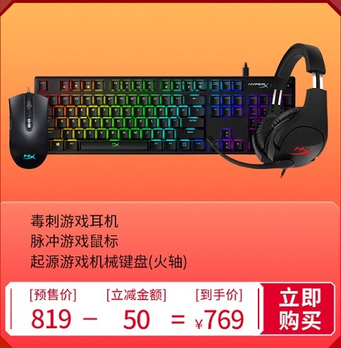 首当其冲的实惠套装就是HyperX毒刺游戏耳机+HyperX脉冲游戏鼠标+HyperX起源游戏机械键盘(火轴)三件套,这套组合预售期到手价只需要769元,性价比超高。