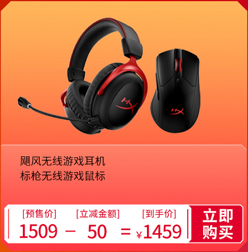 针对高端玩家,还有一套无线游戏耳机与无线游戏鼠标组成的套装,其中包括HyperX飓风无线游戏耳机+HyperX标枪无线游戏鼠标,两款高端无线产品的预售期实际到手价只要1459元。