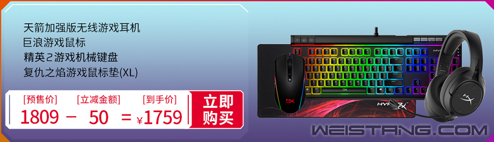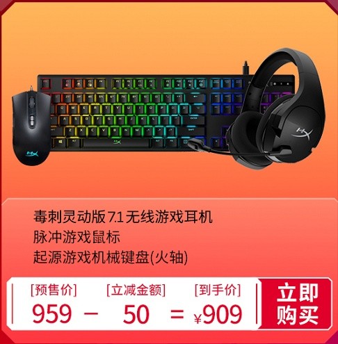 如果希望套装中的耳机是无线的,还要经济实惠,那么HyperX毒刺灵动7.1无线游戏耳机+ HyperX脉冲游戏鼠标+HyperX起源游戏机械键盘(火轴)的套装相当实惠,预售期实际到手价仅909元。