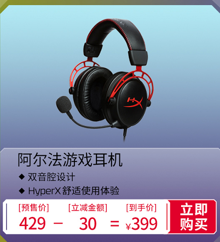 HyperX 阿尔法游戏耳机,双音腔科技一战成名,更被誉为FPS游戏的最佳伴侣,游戏中音频定位能力强、长时间佩戴依然舒适,都是这款游戏耳机的标签。预售期实际到手价只需要399元,相信众多FPS游戏玩家不会错过这个千载难逢的机会。