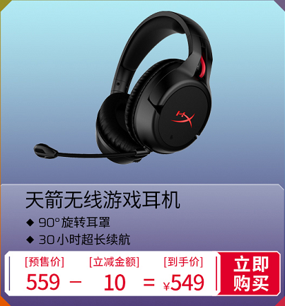 同样拥有30小时长效续航的HyperX天箭无线游戏耳机的价格更具优势,预售期实际到手价只需要549元。