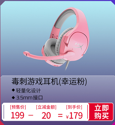 如果双11想送女朋友或“猛男”兄弟一个特别的礼物,HyperX毒刺游戏耳机(幸运粉)是一个很好的选择,大尺寸50mm驱动单元,旋转静音麦克风,时尚的粉色配色,预售期实际到手价仅179元。