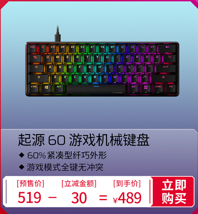 此外,60%布局的HyperX起源60游戏机械键盘也受到玩家们的广泛关注,设计上仅保留字母键区域,紧凑小巧的外形能节约大量桌面空间,让这款游戏机械键盘更加精致和纯粹,预售期实际到手价489元。