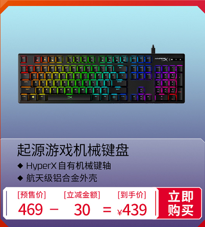 键盘品类中首先值得关注的是HyperX起源游戏机械键盘,它采用了HyperX自主键轴,轴体润滑度高,手感十分出色,航天级铝合金外壳更显品质,可定制的RGB动态光效增加了可玩性,这款键盘的预售期实际到手价只需要439元。