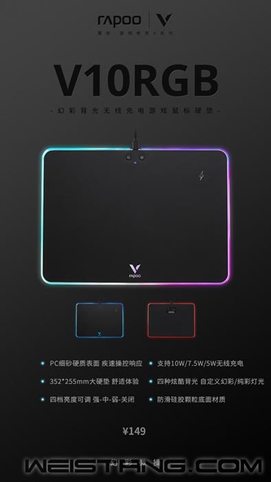 竞技符号,“V”标一眼辨识, 游戏鼠标垫品类拓展全新游戏体验概念, 真实世界与异想世界之间的界限逐渐变得模糊, 沉浸感,一以贯之的主旋律,全新而独特的互动体验空间。 RGB,灯光秀,亮色添彩, 硬垫,优化材质提升鼠标操控移动, Qi无线充,10W/7.5W/5W根据设备自动匹配, 雷柏V10RGB,微操垫行者,get正确续航方式。 流畅线条,颜值与性能兼顾, PC+PS+硅胶三层材质, 通过测试多传感器确保精准的识别感应, 352*255mm大硬垫,防滑硅胶颗粒底面材质, 行云流水,移动流畅,解锁疾速新体验。 四种RGB灯光模式,四档亮度可调, 恣意伸展成不可或缺的光芒。 点开视频,聚光灯准备! 视频连接: https://www.bilibili.com/video/BV1kb4y1t7oF V10RGB选用PC+PS+硅胶三层材质构建鼠标垫,PC硬质细砂表面纹理通过测试多传感器确保精准的识别感应,优化材质提升鼠标的操控移动。细腻耐磨,更好,更舒适。 硬朗线条开启雷柏鼠标垫设计语言,捉对厮杀,战况升级,内置四种炫酷灯光模式,千万色卡定义幻彩桌面。多说一句,雷柏V10RGB还配有智能指示灯,无论待机、充电还是放偏,无需点按多此一举,瞄一眼就可了然于心。 雷柏V10RGB加入Qi无限充电标准协议,10W/7.5W/5W根据设备自动匹配,开团时刻也能随放随冲,及时补能告别赛后缺电失联。能量加满,新赛季开启。 |