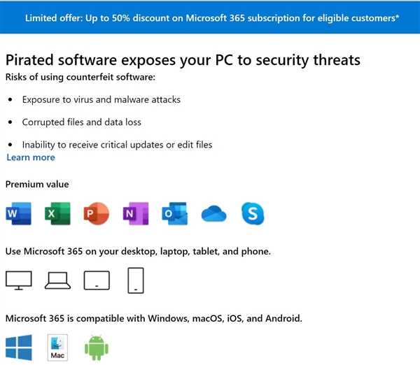 还有相当一部分用户正在使用盗版Office软件,之前的案例中,微软常采取法律手段强硬应对,现在风向似乎变温和了。 有用户发现,自己收到了微软的促销通知,内容是提示当前正在使用的盗版Office会让电脑暴露在危险中,极易遭受攻击,同时还有损坏文件或者数据丢失的风险。 接着,微软开始宣传Office 365如何好,并提供高达50%的订阅优惠价。 据悉,半价优惠只可用于Microsoft 365的头一年,包括家庭版和个人版,目前在国行商城,两者的年费原价分别是498元和398元。 不知道此举是Office团队为了达成年度KPI业绩的临时之举,还是说从根上想明白了,与其对抗,不如采取更温柔友好的方式做大用户基数。 |