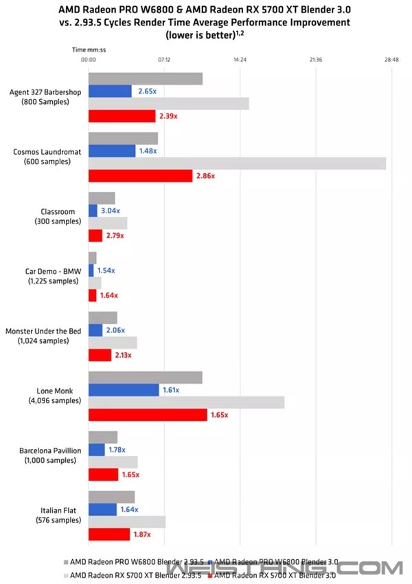 Blender是一款开源的3D渲染软件,很多人都用它测试过CPU及GPU,官方日前发布了最新版Blender 3.0,相比之前的2.X版大幅优化了AMD显卡的表现,AMD表示RX 5700 XT显卡在3.0版中平均性能提升2倍多。 Bleder 3.0版本的目标是建立在以前版本的UI和工作流程的基础上,并进一步改进。Blender 3.0为整个3D工作流的用户体验进行了多项改进,亮点包括基于节点的程序建模系统以及高级资产浏览和管理。 跟进AMD所说,作为新Blender为了适配这一系列更新,AMD开发了新的方法,使用开源的AMD HIP API重构了Blender在全新“Cycles X”更新中用来做GPU加速计算的标准代码,使其编译后可以支持AMD的GPU。 要在Blender 3.0中使用Cycles,用户需要AMD Radeon Software Adrenalin 21.12.1或AMD Radeon PRO Software for Enterprise 21.Q4 (或之后的版本)的驱动版本。 目前AMD验证过的显卡包括AMD Radeon PRO W6800和AMD Radeon RX 6000系列桌面显卡,并也允许在其他AMD RDNA和AMD RDNA 2架构的显卡上启用。 性能提升方面,在使用AMD HIP API加速的Blender 3.0 Cycles X渲染器上,AMD Radeon PRO W6800在8个Blender场景中渲染的平均速度比过去使用OpenCL的Blender 2.93.5 Cycles渲染器快了1.97倍。 同样的,在使用AMD HIP API加速的Blender 3.0 Cycles X渲染器上,AMD Radeon RX 5700 XT在8个Blender场景中渲染的总平均比过去使用OpenCL的Blender 2.93.5 Cycles渲染器快了2.12 倍。 |