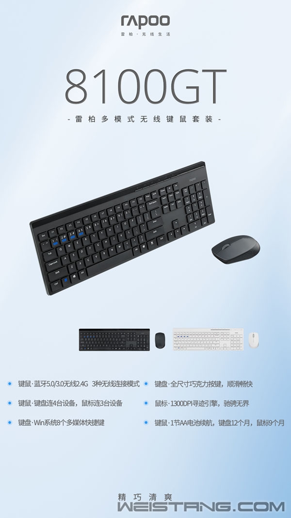 一种简单,不简单, 一个连接,无线表现, 素净的黑白色, 经典比例和富有表现力的性能。 摒弃一切嘈杂,简明大方, 雷柏8100GT多模无线键鼠。 亮光装饰条包边,磨砂工艺上盖, 利用不同材质勾勒键盘, 8个Windows系统快捷键, 强调便捷功能,让操作更简单, 并在此状态下保持经久耐看。 摩登线条完成舒适手感的注解, 静音微动,1300DPI寻迹引擎, 左右对称灵活操控鼠标更专注。 蓝牙5.0/3.0、无线2.4G三种连接模式, 键盘可连接4台设备,鼠标可连接3台设备, 广泛适配设备、系统,实现快速切换, 简单,优雅,自在,随心。 远观的优雅,触碰的悸动, 简单干净的面孔和性能灵魂, 雷柏8100GT,生活会简单宁静很多。 8100GT采用蓝牙5.0/3.0和2.4G三种职能连接模式,适配设备更为广泛,键盘可同时连接4台设备,鼠标可同时连接3台设备,键鼠可在各个设备间快速切换,面对工作再繁杂亦能轻松应对,搭配雷柏自主研发省电程序,辅以低功耗芯片,在各使用一节AA电池的情况下,键盘续航可达12个月,鼠标续航可达9个月,免去频繁更换电池的困扰,保障持久办公,省心又舒心,助力效率办公。 键盘采用全尺寸设计,带有数字小键盘,使得日常办公更加方便,搭配巧克力独立键帽和磨砂工艺上盖,亮光装饰条包边,让整体视觉上有着菱角分明的质感,并且操作轻盈如水,长时间码字也能舒适自如。还有一个便捷的设计就是键盘自带了8个windows系统快捷键,一键即可调出主页、邮件、音乐播放等操作,提高效率的同时,还兼顾了娱乐。 鼠标上盖采用细腻的磨砂表面处理工艺,手感舒适,质感细腻。两侧橡胶孔状设计和滚轮防滑格栅设计,带来了良好的防滑效果。还有一个很贴心的设计就是鼠标采用静音微动,有效的减少了使用噪音,适宜图书馆等地方使用,打造一个宁静的工作环境,无论工作学习,都能轻松应对。搭载1300DPI寻迹引擎,无论在木制、皮革、纸张等表面上使用,亦能操作顺畅,快速移动,让你可以随时随地进入工作状态。 |