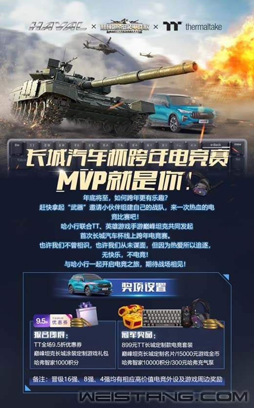 转眼间,2021年即将过去,新的一年即将到来,如何才能让这个跨年的时间变得更加有趣呢? 哈弗联合TT、英雄游戏手游巅峰坦克共同发起这次首届长城汽车杯线上跨年电竞赛。快快拿起“武器”,邀请小伙伴们一起组建属于自己的战队,来一次热血激情的电竞比赛吧! 也许我们不曾相识,也许我们从未谋面,但我们都因为热爱而追逐,无快乐,不电竞!快来与哈小行一起开启一场激动人心的电竞之旅,期待与你在战场上相见! 本次活动于12月15号开启,活动持续时间长达一个多月,哈小行带你体验一场令人激动的跨年电竞赛,并且,在带你体验让人热血沸腾的刺激战场的同时,哈弗、TT以及巅峰坦克还为大家准备了丰厚的奖品和礼物包括哈弗智家积分,包括:TT产品优惠卷,TT外设以及巅峰坦克定制游戏礼包。所有玩家,只要报名参加活动即可获得TT全场优惠券、巅峰坦克长城定制游戏礼包以及哈弗智家1000积分;而获得冠军的队伍,更可以获得包括TT外设大礼包、巅峰坦克长城定制名片/15000元游戏金币、哈弗智家10000积分/300元的哈弗充气泵。另外,晋级16强、8强、4强也均可以获得相应的高价值电竞外设及游戏周边奖励,是否有感到心动呢?还在等什么,赶紧叫上自己的小伙伴一起微信扫码参加这次跨年电竞盛宴吧! |