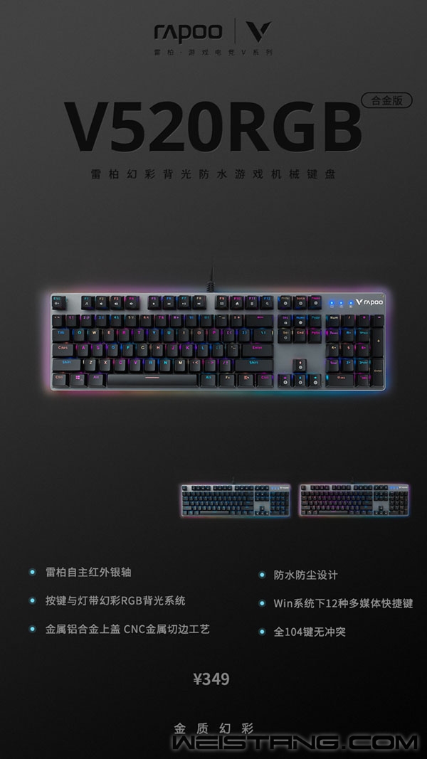 对于游戏爱好者来说,除了对电脑性能的要求高以外,对于一款游戏键盘的选择亦然严格,雷柏V520RGB合金版幻彩背光防水游戏机械键盘的104键无冲突设计、 Windows键锁定功能,不仅能助力在游戏中打出更好的操作,雷柏自主红外银轴的加持下,奏响哒哒哒的战斗号角,也能带来满足的快感。防水防尘的设计,哪怕浸入水中也能继续战斗,加上炫酷的RGB双背光系统,助力电竞氛围,尽显电竞霓虹,给电竞玩家们一个全新的版本答案。 物理BUFF,锁定MVP 游戏世界里各类炫酷至极的操作,都来自于玩家手速及游戏键盘的加持,“工欲善其事,必先利其器”,全键盘104键无冲突设计,使玩家在操作R闪、拿狙进行飘忽不定的连跳,这种需要多键组合快速触发的技能更加得心应手。并且有一个很贴心的设计,Windows键锁定功能,可以有效防止专心游戏时因误触Win键切出画面导致影响战局走向。在这两款BUFF的加持之下,享受物理加成的沐浴,腿持挂件亦能legendary。 防护堡垒,无懈可击 能打能抗,拿下胜利时激动的打翻饮品,干饭时撒漏在键盘上的残渣剩饭,皆能轻松消灭,键盘外部接缝处的严丝合缝,内部采用疏水纳米涂层保护加上红外光技术的雷柏自主银轴,搭配整体悬浮于面板之上的键位,使得清洁便易。急性子的小伙伴甚可直接泡水清洗,涅槃归来,继续战斗,能打亦能抗! 电竞氛围,黑夜破晓 无光不电竞,幻彩RGB双背光系统,全边框的RGB背光灯带四周环绕,键盘多达19种预设按键灯效,并支持自定义灯光效果,根据自身喜爱制定专属于你的电竞色彩。指尖在梦幻流光中跳动,搭配敲击时,雷柏自主红外银轴类青轴Click的段落感,激起战斗快意,点燃每一个鏖战的夜晚,电竞氛围感直线拉满。 键盘以防水防尘的功能特性,使其面对复杂环境,多样战场亦能战斗自如,搭配104键全键无冲突设计加双RGB背光系统,造就游戏内外皆能打能扛,正如所有电竞玩家的精神一般,是勇于拼博,是不断超越,是面对困难依然能保持内心的无懈可击。雷柏V520RGB合金版幻彩背光防水游戏机械键盘,官方指导价349元,现已上市。 |