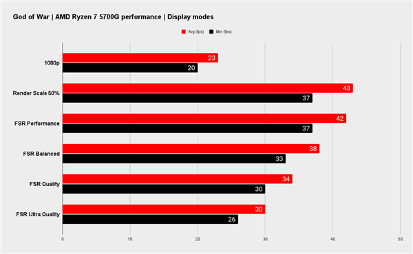 近日PC Gamer发文称《战神4》在PC上运行地非常好,以至于我们甚至都不需要一个显卡来游玩。在文中,他们使用AMD Ryzen 7 5700G APU运行《战神4》,意外发现能流畅运行。 AMD Ryzen 7 5700G是一个价格略贵的APU,售价359美元(国内2199元)。这是AMD 7纳米制程CPU,8核心16线程,最大睿频4.6GHz,集成Radeon Vega显卡,512个GCN核心,频率2Ghz。 经过一番设置后,5700G运行《战神4》的表现可以参考下方图表。在默认1080P下,游戏平均FPS只有23帧,情况不太乐观。 《战神4》为5700G提供了两个选择来改善帧数。 第一个是通过《战神4》游戏“显示”设置菜单底部的“渲染规模”来控制,将其设置成最低渲染(50%),以960x540来渲染游戏,然后将其提升至1920 x1080屏幕原生分辨率。 结果虽然有点模糊,但帧数翻了一倍,来到了43fps。 第二个就是使用AMD的FSR技术。虽然该技术也会导致画面有些模糊,但也会取得非常不错的性能表现。PC Gamer建议将FSR调整至平衡模式,虽然这样做帧数会下降至38FPS,但游戏画面更清晰一些(渲染分辨率1130 x 636)。 |