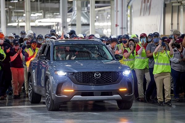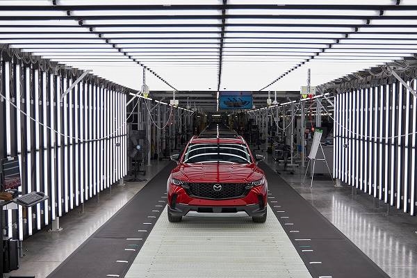 近日,马自达CX-50正式下线,新车于阿拉巴马州的丰田马自达联合制造厂生产,与丰田卡罗拉Cross共线,生产比例为50:50,据悉该工厂的年产能可达30万辆。 该车是马自达针对北美市场研发的全新产品,基于前驱横置平台打造,搭载了2.5L和2.5T直列四缸发动机,有望于今年春季正式上市交付。 首款下线的CX-50采用金属灰色车漆作为纪念,同时还提供国内用户十分熟悉的“魂动红”等其他颜色供消费者选择。 虽然是一款“特供车”,但马自达CX-50依旧采用了家族化的设计风格,不同于国内CX-5的柔美,用上了跨界风格外观套件的新车多了几分硬朗。 大尺寸的盾形中网覆盖有黑色的涂装,与两侧同样使用了黑色装饰件的大灯相连,营造了十足的野性和神秘,发动机舱盖上覆盖有磨砂质感的装饰件,中间位置则镌刻有CX-50的字样,格外具有辨识度。 而外凸的前后黑色轮眉、涂黑处理的侧裙、双边共两出的排气等元素进一步加强了新车的运动感和视觉效果。 内饰的风格相当简约,大屏当道时代,马自达CX-50的中控台上仅有一块长条状的悬浮式屏幕,而仪表盘则采用了液晶+机械式的组合,保持了马自达一贯的“固执”。 动力方面,CX-50依旧提供2.5升自然吸气和2.5升涡轮增压两款直列四缸发动机,最大输出187和250马力,匹配6速自动变速箱,并全系标配四驱系统。 |
