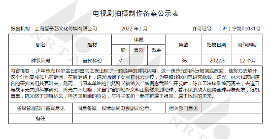 根据2022年1月电视剧拍摄备案,刘慈欣欣小说改编《球状闪电》电视剧已由上海爱奇艺文化传媒有限公司报备,将于3月份正式开拍,唐探系列导演陈思成监制,总计36集,拍摄日期为2022年3月,制作周期为12个月。 少年陈光14岁生日的雷雨之夜出现了一颗诡异的球状闪电,这一夜陈光的命运被彻底改变,他努力去解开这个让他变成孤儿的谜团。 在解谜路上,陈光遇到了女军官林云少校,为突破球状闪电研究瓶颈,陈光、林云和志同道合的研究者们共克难关,然而,当原本单纯的自然科学被纳入“新概念武器”开发时,陈光无法接受愤而离去,去追寻与战争无关的科学研究。 陈光并不知晓,来自宇宙的地外文明正悄然来到地球,看不见的敌人使得全球异象频发,危机重重,陈光终于理解林云,再次回到她的身边,与科学家们一起守护属于祖国、属于地球的未来。 |