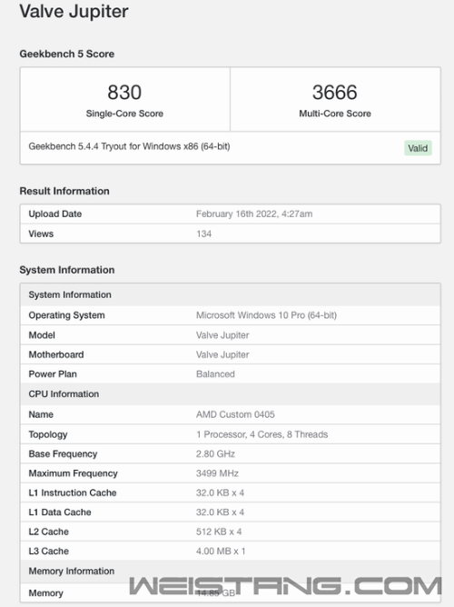 据Benchleaks消息,即将上市的Steam Deck掌机现已现身Geekbench跑分平台。 Steam Deck搭载的这款AMD定制处理器为4核8线程,主频为2.8GHz,最高3.5GHz,4MB三级缓存。 Steam Deck处理器单核830分,多核3666分,远不及最新的笔记本处理器,与AMD 2019年发布的R7 3700U跑分类似。 Steam Deck搭载了AMD的Van Gogh APU,Zen2架构,2.4GHz到3.5GHz。 采用集成了8CU的RDNA2 GPU,频率为1.0GHz到1.6GHz,性能为1.6TFops FP32。整个SoC的TDP为4到15W,支持16GB LPDDR5内存。 存储可选64GB eMMC和256GB、512GB NVMe SSD。消息称,该游戏掌机将于2月25日发售 |