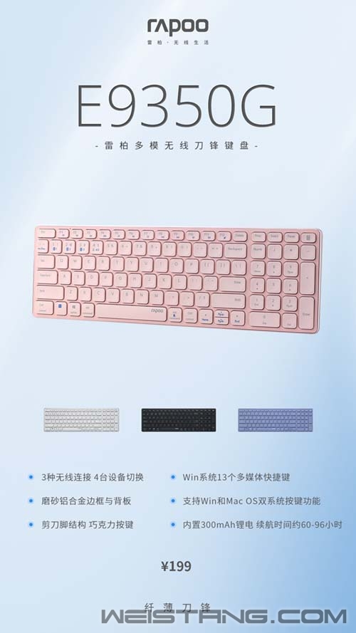 靠近一点,轻触一点, 浪漫在色彩的摇曳下如约降临。 多元气质、创意与革新、可持续时尚, 雷柏E9350G多模无线键盘, 探寻盎然色彩与纤薄触感的故事, 一种立场,一种风格。 冷艳紫、流行粉,刚柔冷暖,温柔无边柔情满溢,放大系列的感染力。 纯简白、韧劲黑,分立于光谱两端,是在时间与光影的轮转中产生的神秘力量。 磨砂铝合金材质填充边框与背板,最薄处5mm,让更轻、更薄成为未来新商务时尚。 抓人眼球的色彩和吸睛的细节, 剪刀脚结构巧克力按键,内凹设计贴合手指敲击,汇聚纯粹能量, 在拥有时髦的同时,感受不被束缚的乐趣。 在姿色各异的百花园里,坦然舒展自身美丽, 兼容Win和Mac OS的双系统按键功能, 蓝牙5.0、蓝牙3.0、无线2.4G三种连接方式, 可连接4台终端设备,快速切换, 寻觅减轻工作焦虑的强心针。 点开视频, 时尚、治愈和实用主义, 在情感与精神的生活工作旅程中持续释放着能量。 |