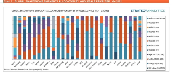 2月21日消息, StrategyAnalytics发布会的最新报告显示,2021年Q4,全球智能手机行业批发收益和平均售价分别同比增长6%和9%,2021年全年也分别同比增长15%和10%。 其中,苹果保持了领先地位,三星紧随其后,收入份额较去年有所提高。在收益方面,小米保持第三位,其次是OPPO和vivo。 荣耀超过了realme,升至第6位,紧随其后的是realme、联想-摩托罗拉、华为和传音。 另外,苹果是1000美元以上手机份额最高的厂商。 以下为各品牌各价格档占比情况: 另外,从出货量来看,苹果Q4以22%的份额排名第一,其次是三星、小米、OPPO、vivo。三星2021年全年则保持了第一。 |