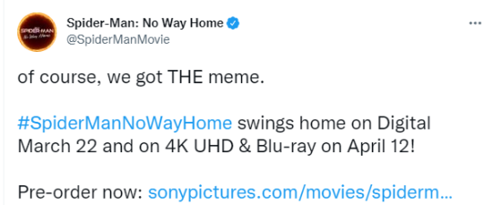 今日,电影《蜘蛛侠:英雄无归》官方宣传其数字版以及实体版,宣布将于3月22日推出数字版,并将于4月12日推出4K UHD版和蓝光版。 不过官方的配图很有意思,这是其第一次在社交平台上玩起了多虫互指的梗。 官方表示如果你在电影院看过《蜘蛛侠:英雄无归》,这部电影值得你再看一遍。 《蜘蛛侠:英雄无归》是英雄系列三部曲的完结篇,也标志着漫威多元宇宙的正式开启。此次,蜘蛛侠(汤姆·赫兰德 饰)与奇异博士(本尼迪克特·康伯巴奇 饰)继《复联4》后再度联手打响时空混战。蜘蛛侠借助奇异博士操控时空的能力打开了时空通道,引发了前所未见的危机。 |