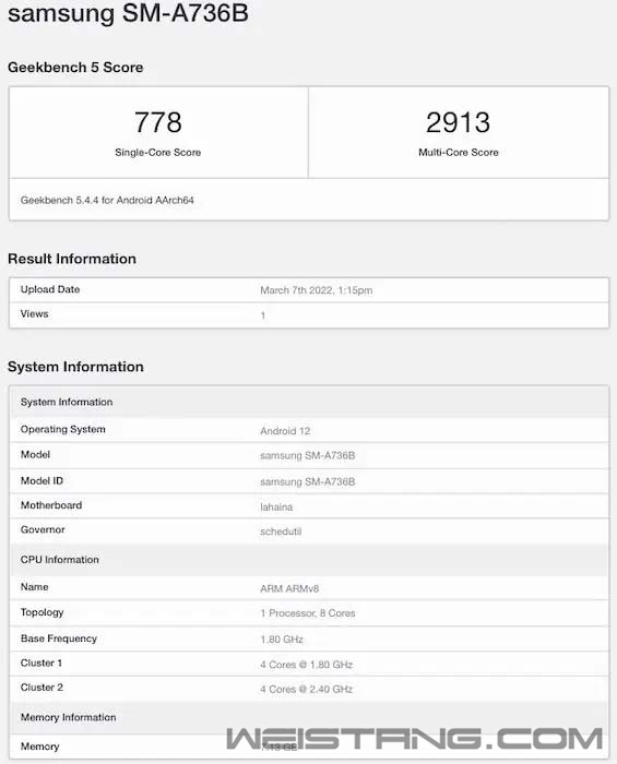 近日,三星Galaxy A73 的跑分现身Geekcbench,页面信息显示,这款手机的跑分成绩单核为778,多核为2913。 这跑分与骁龙778G处理器相当,内存为8GB,三星有可能还会为该机提供6GB内存版本。 此前有传言称Galaxy A73会采用骁龙750G处理器,不过这不太更符合该机的定位,现在加上这个跑分的佐证,采用778G处理器就让曝料的真实性就高了不少。 除了处理器以外,Galaxy A73据称会采用6.7寸AMOLED 屏幕,分辨率为FHD+、支持 120Hz刷新率、还有屏下指纹识别。 后置摄像会采用四摄方案,预计会搭载1亿像素的主相机、1200万像素的超广角镜头、800万像素的长焦镜头、以及200万像素的微距镜头。 续航方面,预计该机会搭载5000mAh容量的电池,最高支持33W快充。 不过,Galaxy A73还没有确切的发布日期,预计很快就会在亚洲、欧洲和中东等多个市场推出。 |