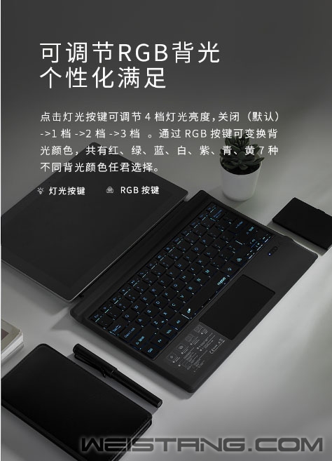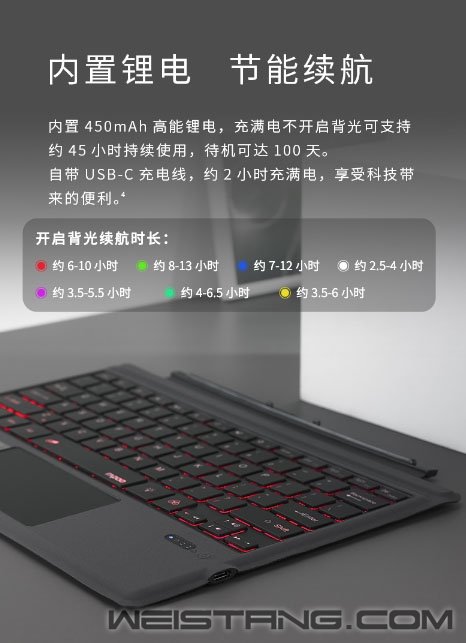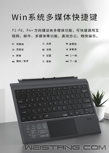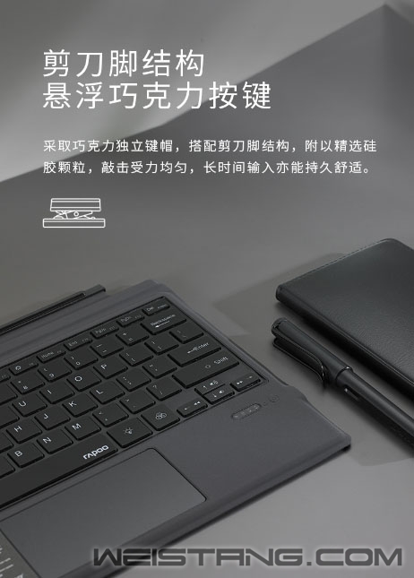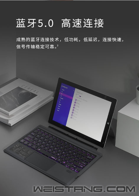 相信大多人选择Surface Pro平板都是为了其随时随地办公的便利性,近日,领军国产外设品牌,实力大厂上市企业Rapoo雷柏,推出了XK200S RGB背光蓝牙键盘(SF版),蓝牙5.0高速稳定连接,带有个性化RGB背光,专为Surface Pro而生,接下来让我们一起来看看这款键盘吧。 XK200S专属于Surface Pro 3/4/5/6/7五款12英寸平板,1:1真机开模,使得在平板上能有笔记本电脑般的享受,帮助工作效率直线上升。 键盘采用蓝牙5.0连接技术,低功耗、低延迟、提供高速稳定的信号传输。搭配可调节的RGB背光系统,共有红、绿、蓝、白、紫、青、黄7种不同背光颜色,4档灯光亮度调节任君选择,用灯光颜色,来表达情绪。 操作方面,键盘有着宽敞触控区域,支持4指操作和多种手势,识别准确灵敏,并在Win10系统有着12种便捷手指操作。搭配Win系统12个多媒体快捷键,可快速调用互联网、邮件、多媒体功能,方便快捷,让办公娱乐,仿佛有了新的打开方式。 剪刀脚结构和巧克力按键的加持下,使得每次输入敲击都受力均匀,长时间码字也能持久舒适,搭配纤维PU面料,纤薄厚度,耐刮防滑,透气耐脏。视觉触觉双重良好体验。多说一句,键盘内置450mAh高能锂电池,让你的舒适,更久一些。 |