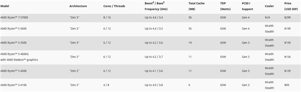 除了号称重夺最强游戏CPU地位的锐龙7 5800X3D缓存版,AMD今天还发布了六款锐龙处理器新品,定位主流和入门级市场,总算填补了锐龙5000系列一直仅限中高端的缺憾。 六颗新U有一半是Zen3架构,一半是Zen2架构,热设计功耗都是65W。 锐龙7 5700X: Zen3架构,8核心16线程,二级缓存4MB,三级缓存32MB,频率3.4-4.6GHz,支持PCIe 4.0,价格299美元。 锐龙5 5600: Zen3架构,6核心12线程,二级缓存3MB,三级缓存32MB,频率3.5-4.4GHz,支持PCIe 4.0,价格199美元。 锐龙5 5500: Zen2架构,6核心12线程,二级缓存3MB,三级缓存16MB,频率3.6-4.2GHz,支持PCIe 3.0,价格159美元。 锐龙5 4600G: Zen2架构,6核心12线程,二级缓存3MB,三级缓存8MB,频率3.7-4.2GHz,集成Vega7 GPU,支持PCIe 3.0,价格154美元。 锐龙5 4500: Zen2架构,6核心12线程,二级缓存3MB,三级缓存8MB,频率3.6-4.1GHz,支持PCIe 3.0,价格129美元。 锐龙3 4100: Zen2架构,4核心8线程,二级缓存2MB,三级缓存4MB,频率3.8-4.0GHz,支持PCIe 3.0,价格99美元。 值得注意的几个地方: - 锐龙7 5700X可超频,无原装散热器,其他都自带幽灵Stealth。 - 虽然都是Zen3架构,但是锐龙7 5700X、锐龙5 5600的核心是桌面版Vermeer,锐龙5 5500则是移动版Cezanne,所以它的三级缓存只有一半,也不支持PCIe 4.0。 - 锐龙5 4600G是唯一的APU,其实它本来就有,但之前仅供OEM,两年了现在终于开放零售,上还有锐龙7 4700G,下还有锐龙3 4300G。 - 锐龙5 4500、锐龙3 4100应该是屏蔽GPU的产物,和锐龙4000G一样基于Renoir核心。 以上处理器均将在4月4日上市。国行价格稍后公布。 根据此前消息,AMD还准备了另外三款新品,下个月发布,分别是: 锐龙7 5700: Cezanne,8核16心线程,三级缓存16MB,频率不详,热设计功耗65W。 锐龙3 5100: Cezanne,4核心8线程,三级缓存不详(8MB?),频率不详,热设计功耗65W。 锐龙7 4700: Renoir,8核心16线程,三级缓存8MB,频率3.6-4.4GHz,热设计功耗65W。 |