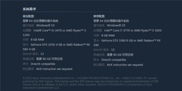 日前,小岛秀夫大作《死亡搁浅:导演剪辑版》PC版正式发售,拥有游戏本体的玩家仅需48元即可升级“导演剪辑版”,此前未购买《死亡搁浅》的玩家则需要花费198元来购买。 Steam页面显示,该作的最低配置要求为i5-3470/锐龙3 1200+GTX 1050/RX 560显卡,推荐配置为i7-3770/锐龙5 1600+GTX 1060/RX 590。内存要求8GB,游戏存储空间需80GB。 据介绍,《死亡搁浅:导演剪辑版》拥有高帧率和拍照模式,支持超宽带鱼屏,同时还包括《半条命》系列和《赛博朋克 2077》的联动内容。《死亡搁浅:导演剪辑版》游戏在原作基础上添加全新剧情任务、近战与枪械强化、同行机器人等大量新要素。 值得一提的是,《死亡搁浅:导演剪辑版》未来也将支持Intel最新的Xe Super Sampling(XeSS)图形处理技术。 资料显示,《死亡搁浅》是一款由Kojima Productions开发,索尼互动娱乐于2019年11月8日发售的动作游戏。 游戏讲述了主人公山姆必须勇敢直面因死亡搁浅而面目全非的世界,团结现存社会,拯救异空间人类的故事。 |